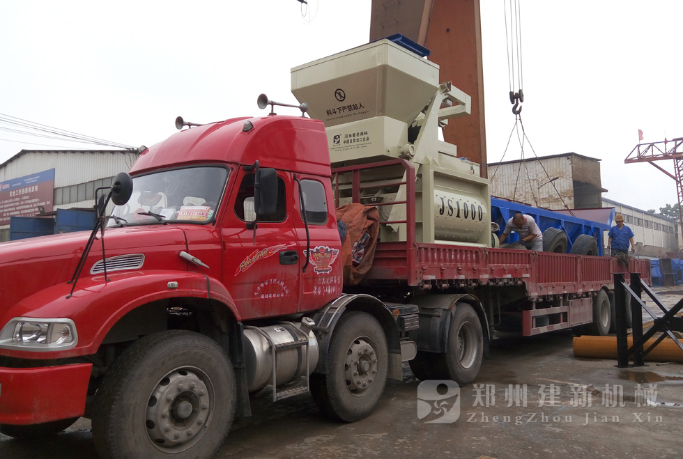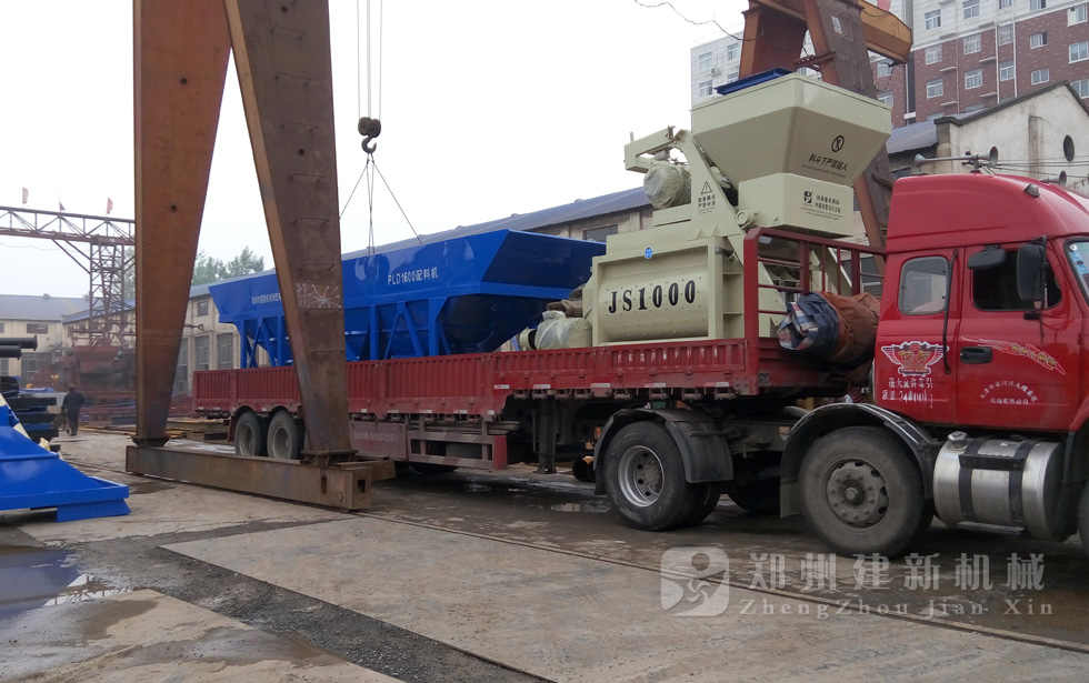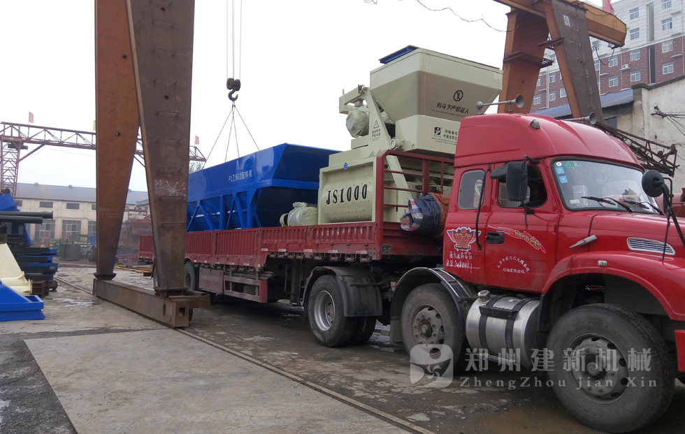 2015年7月16日,一套发往河北唐山的HZS50混凝土搅拌站设备在郑州建新装车,等待发货。